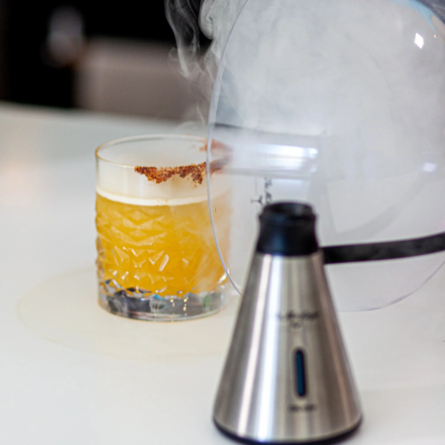 The Mixologer cocktail smoker adds aromatic complexity and variety of natural smoky flavor to cocktails in just a few minutes! This sleek smoker is designed to be used for our signature smoked cocktails that are infused with Cherry, Walnut, and Apple wood chips.